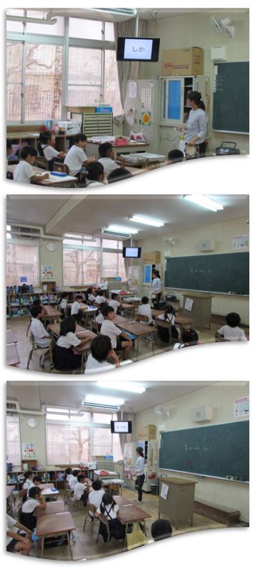 1年生のモジュール学習の様子です。モジュール学習とは、短時間で行う反復学習です。1年生では、テレビ画面に絵と言葉を映し出し、リズムに乗って発声する練習を行っています。ひらがなを正しく覚えることも目標としています。