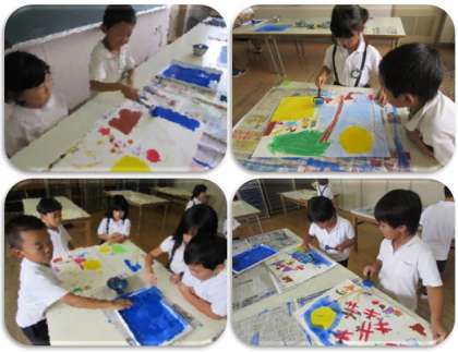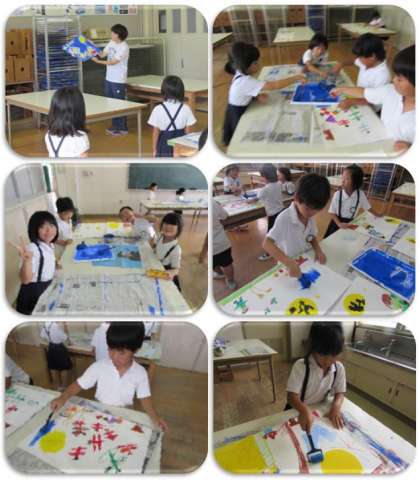 1年生の図画工作の学習です。パスで描いた絵に、絵の具で色をつけました。初めての図工室での学習、初めての絵の具の学習です。どきどきしながら色をつけ、出来上がった絵を見て、子どもたちは「わあ。」と、感心していました。