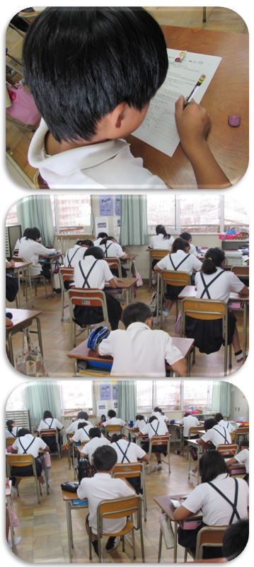 6年生の学習の様子です。初めに、社会科のミニテストを行っています。「江戸幕府を開いたのは」「大名を3つに分けると」「海外との行き来を禁じた政策は」など、江戸時代のことを問うています。
