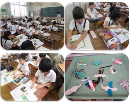3年生の理科の学習です。こん虫のからだのつくりについて、まとめています。あたま・むね・はらの3つに分かれること、足が6本、はねが4枚あることなどを確認しました。また、ねん土やストローなどを使って、こん虫のからだを作り、はねや足の数を確かめています。