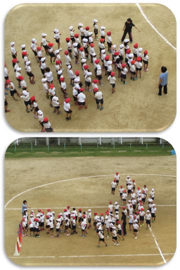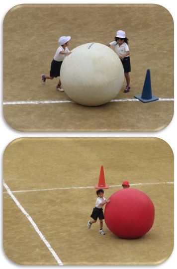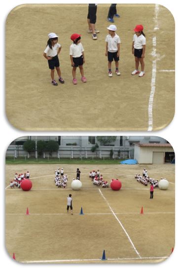 2年生の運動会の練習です。初めに、徒競走の入退場や、スタート位置の確認をしました。その後、大玉ころがしの練習をしました。今日は2人ずつ、実際に大玉を転がしてみました。
