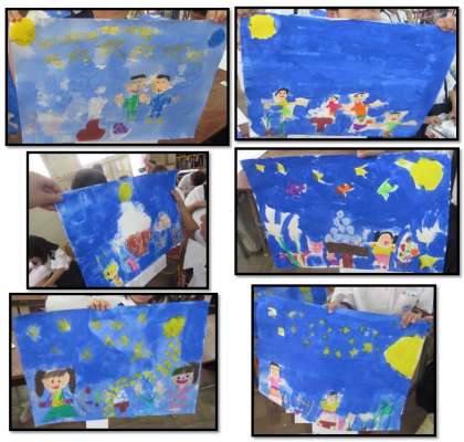 1年生の図画工作の作品です。パスで描いた絵に、青い絵の具を塗りました。出来上がった絵の鮮やかさに、子どもたちもにっこり笑顔になりました。