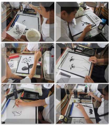 6年生の図画工作の学習の様子です。水墨画の学習です。雪舟の作品などを調べて、模写に挑みました。墨の濃淡も生かして、表現しようと頑張りました。