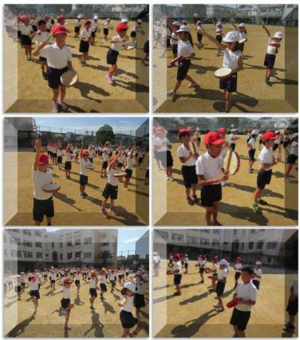 3年生の運動会の練習です。今日は、パーランク—(沖縄でエイサーや民俗芸能で使用される 手持ちの片張り太鼓)を持って、踊りました。太鼓の音が響き、子どもたちの動きもきびきびしたものになりました。