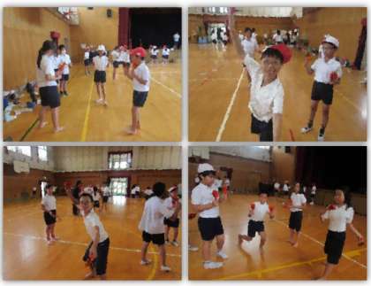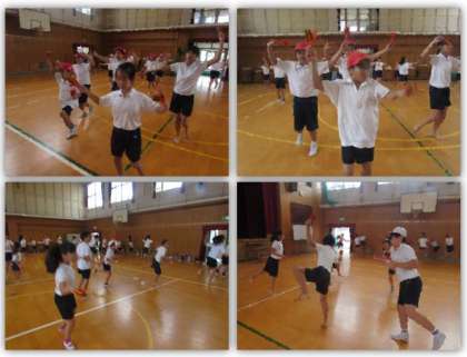 5年生の団体演技の練習の様子です。今日は各自が鳴子を持ちました。鳴子を手にすると、なんだかわくわくしてきます。踊りが始まると、鳴子の音が響いて、迫力が増してきます。