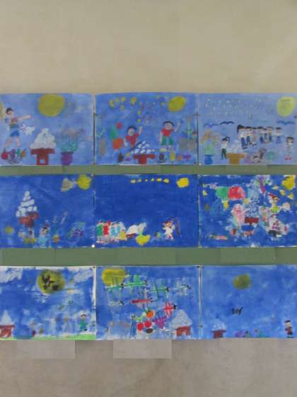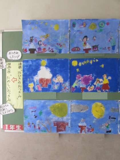 1年生の図画工作の作品です。道徳で「14ひきのおつきみ」を学習し、図画工作で「たのしいおつきみ」を描きました。パスで描いた後、青い絵の具で塗りました。大きな丸い月や、お月見をする楽しそうな人たちが描かれています。