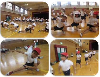 2年生の運動会の練習の様子です。ビシッとポーズを決める場面です。指先にまで力を入れ、ポーズを決めよう、と頑張っています。退場の仕方も、練習しました。