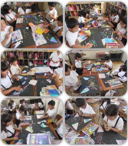 3年生の図画工作の学習の様子です。クラッカーから飛び出してくるものを想像して、描いています。ちらし(広告)を上手に使って、楽しいクラッカーを描きました。