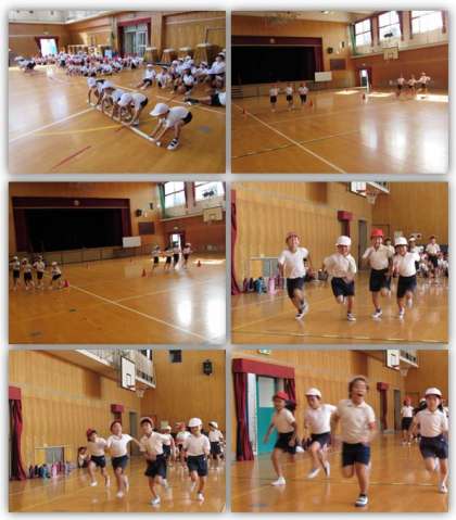 3年生の運動会の練習の様子です。今日は体育館での練習です。初めに、団体競技「ぐるぐるタイフーン」の練習を行いました。棒を持って走る3人、4人のメンバーはもちろん、帰ってきた棒を飛び越え、しゃがんで頭の上を通すチームの他のメンバーとも息が合わなければなりません。