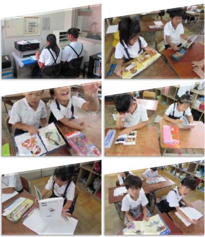 水曜日の朝、読書タイムの様子です。読書タイムには、子どもたちはそれぞれ1冊の本を選び、15分間、集中して本を読みます。画像左上は、読書タイムの音楽を流す図書委員の様子です。