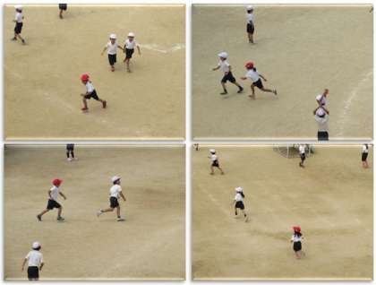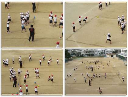 1年生の体育です。3クラス合同で、ドッジボール大会をしました。おにごっこもして、楽しんでいます。