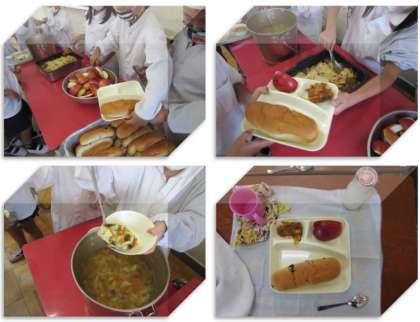 本日の給食の献立をご紹介します。本日の献立は、レーズンパン、なすのミートグラタン、鶏肉と野菜のスープ、りんご、牛乳でした。
