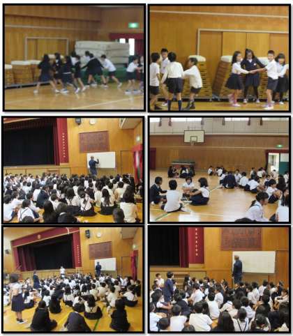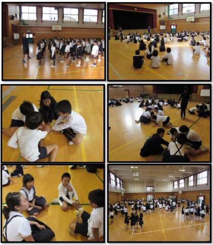 初めに、並び方も4年生が中心になって、声かけをしました。4人組を作り、互いに質問をしたり、手をつないで体育館の中を走ったりして、互いの距離を縮めていきました。