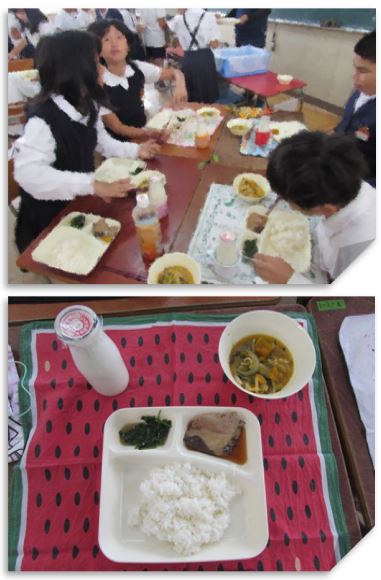 本日の給食の献立をご紹介します。本日の献立は、ご飯、なまりぶしの生姜煮、みそ汁、ほうれんそうの胡麻和え、牛乳でした。