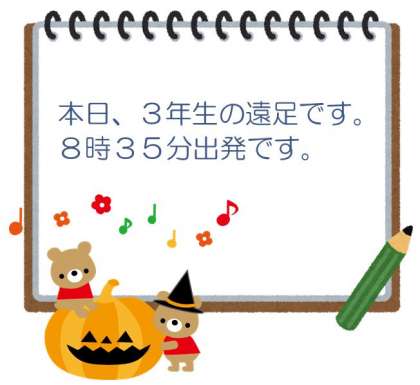 本日、3年生の秋の遠足を実施します。朝は少しひんやりとしていますが、お昼ごろには気温も上がるようです。セーター、ベストなど、着脱の可能な服装がよいかと思われます。よろしくお願いします。
