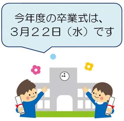 今年度の卒業式の日程が決まりましたので、お知らせします。今年度の卒業式は、3月22日(水)です。