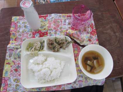 本日の給食の献立をご紹介します。本日の献立は、ご飯、鶏肉のごまだれ焼き、ソーキ汁、チンゲンサイともやしの甘酢和え、牛乳でした。