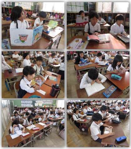 水曜日の朝、読書タイムの様子です。子どもたちは自分で選んだ本を静かに読んでいます。