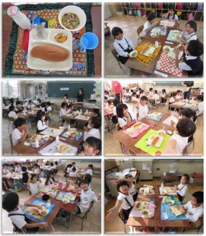 画像は、給食をおいしくいただく1年生の子どもたちです。