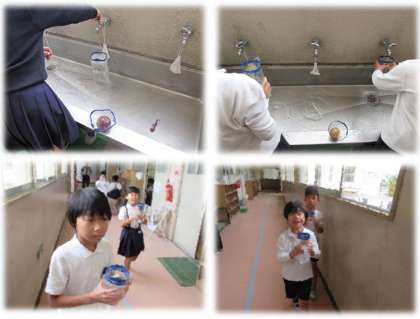 2年生が生活科の学習で、ヒヤシンスの水栽培をしています。今日の生活科では、容器の水替えをしました。球根のおしりが水につかるぐらい、を目安にして、水を入れています。