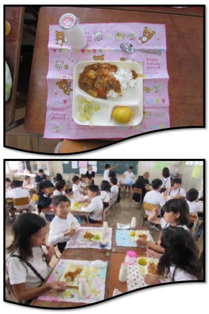 本日の給食の献立をご紹介します。本日の献立は、ハヤシライス、はくさいのピクルス、みかん、牛乳でした。