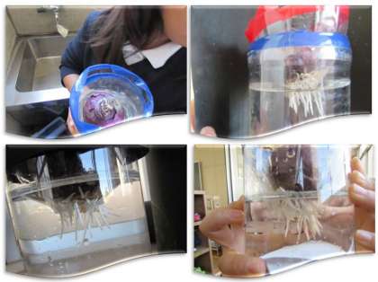 2年生が水栽培をしているヒヤシンスの水替えをしています。球根の底から白い根が出ているものもありました。