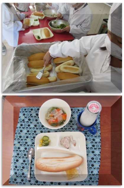 本日の給食の献立をご紹介します。本日の献立は、コッペパン、マーマレード、鶏肉のガーリック風味焼き、スープ煮、きゅうりとコーンのサラダ、牛乳でした。