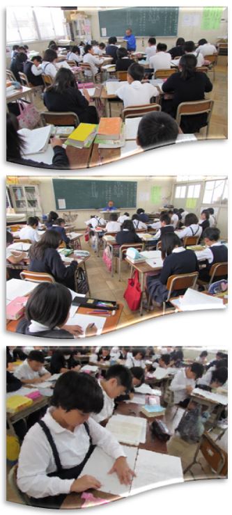 4年生の国語の学習です。原稿用紙の正しい使い方を学習し、実際に原稿用紙に作文を書いています。