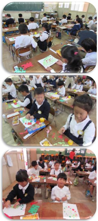 国語「サラダでげんき」を読んで、どんなサラダかな、と想像して、色紙で作ってみました。赤や緑が鮮やかです。