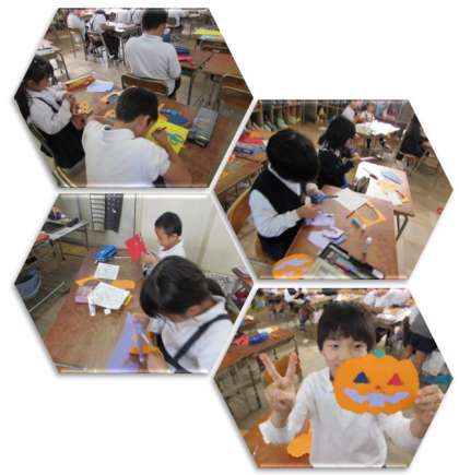 2年生の図画工作の学習です。色画用紙を使って、かぼちゃの飾り(ジャック・オ・ランタン)を作っています。