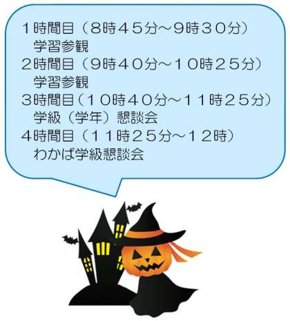 明日10月29日(土)は2学期最初の土曜授業です。1・2時間目は学習参観、3時間目は学級(学年)懇談会、4時間目はわかば学級懇談会となっています。ご多忙とは存じますが、多数ご参会いただきますよう、ご案内申し上げます。