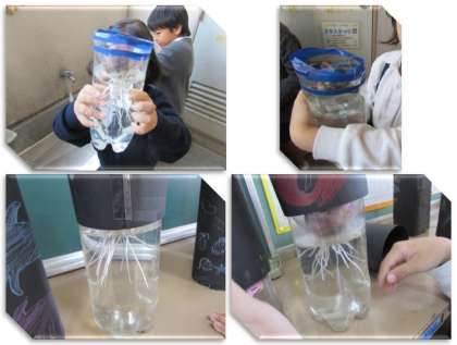毎朝、2年生の子どもたちがヒヤシンスの水替えをしています。「たくさん根が出てきたよ」「根が全然出てこないなあ」と、一喜一憂しています。