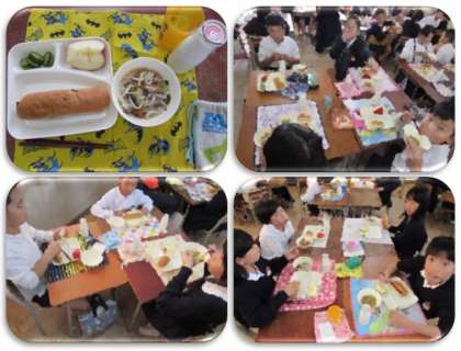 本日の給食の献立をご紹介します。本日の献立は、レーズンパン、肉うどん、あっさりきゅうり、りんご、牛乳でした。