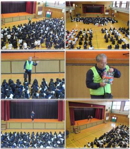 初めに、学校長の話です。「今日は何の日か、知っていますか。今日は立冬といって、暦の上では今日から冬になります。影も長くなりましたね。昼がどんどん短くなり、夜がどんどん長くなっていきます。下校時刻は4時です。」