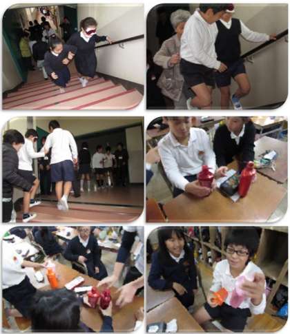 車いす体験では、押す側になって、座る人の気持ちを考えて押すことの大切さ、また、アイマスク体験では、「見えない」ということを理解したうえで助言することの大切さ(こっちにいきます→× 右に曲がります→○ あと5歩進んだら、右に曲がります→◎)などを知ることができました。また、身近なところに、視覚障害のある方にも理解できるような仕組み(シャンプーとリンスの違い、牛乳パックのへこみ等)があることを知りました。