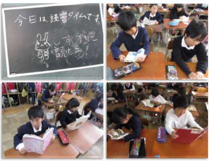 ある教室の黒板には、子どもの手書きの「読書タイムのお知らせ」が貼られていました。子どもたちも、静かに読書をしています。