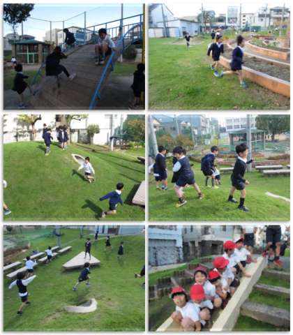 風が冷たく、ふたご山のすべり台のところでは、体をくっつけあって温めあう子どもたちの姿もありました。