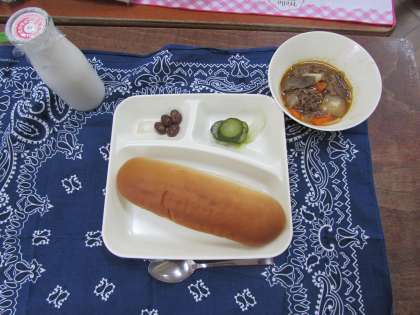 本日の献立は、黒糖パン、牛肉と野菜の洋風煮、キャベツときゅうりのサラダ、うずら豆のグラッセ、牛乳でした。
