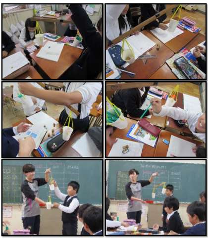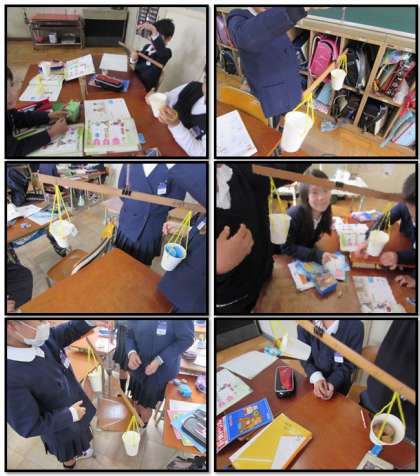 3年生の算数の学習「重さを数で表そう[重さのたんいとはかり方]」です。初めに、それぞれが持つのりやはさみ、消しゴムなどで、どれが重いのかを比べるために、定規と紙コップを使って天秤ばかりを作りました。天秤ばかりを使って、傾いて下になったものの方が重いことがわかりました。