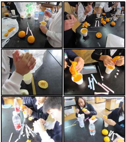 科学クラブは、炭酸水と砂糖、そして各自が持ち寄った果物を使って、炭酸飲料を作りました。果汁の味がおいしかったのですが、甘みを感じるまでには思っていた以上に砂糖がいることに気づきました。