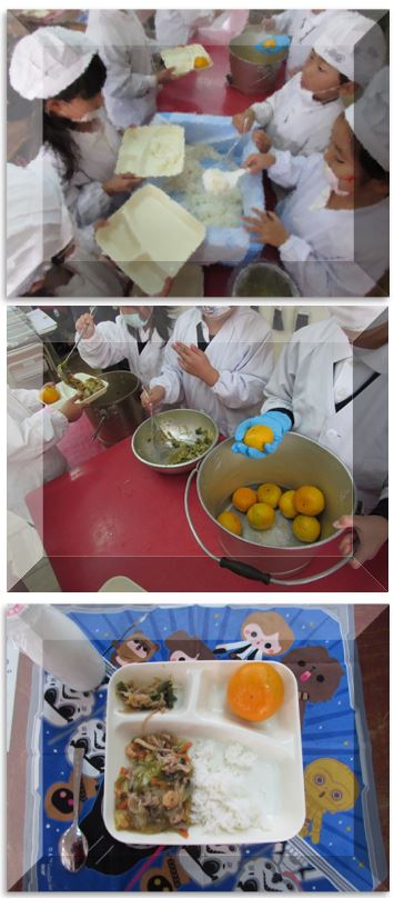 本日の給食の献立をご紹介します。本日の献立は、中華どんぶり、もやしの中華和え、みかん、牛乳でした。