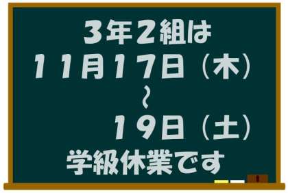 3年2組では、嘔吐・下痢・腹痛などの胃腸炎による欠席が増えたため、17日(木)から19日(土)までの3日間、学級休業といたします。よろしくお願いいたします。次回登校は、11月21日(月)です。