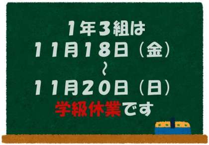 1年3組では、嘔吐・下痢・腹痛・発熱等による欠席者が増えたため、11月18日(金)から11月20日(日)までの3日間、学級休業といたします。各ご家庭におかれましては手洗い・うがいを励行するなど、健康管理に十分ご注意ください。