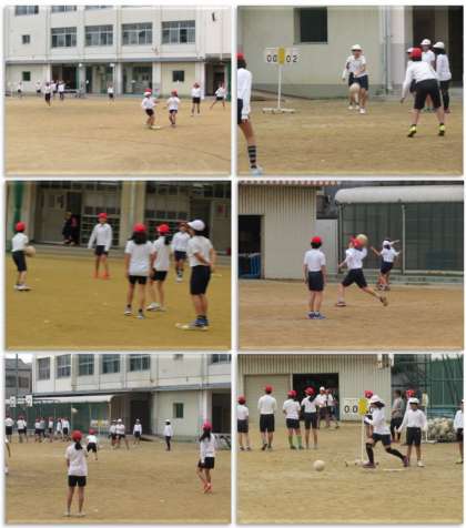 6年生の体育の学習です。運動場でキックベースをしています。友達を応援する子どもたちの声が、運動場に響いていました。