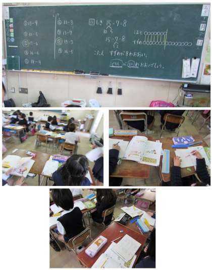 1年生の算数の学習です。くり下がりのあるひき算の計算をしています。ひかれる数、またはひく数の下に「さくらんぼ」を作り、計算をしています。