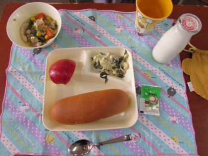 本日の給食の献立をご紹介します。本日の献立は、コッペパン、マーガリン、鶏肉と野菜のスープ煮、ほうれんそうのグラタン、りんご、牛乳でした。