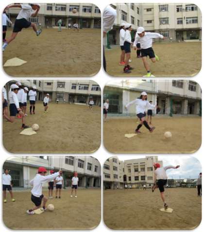 6年生の体育の学習です。運動場で、キックベースを行っています。