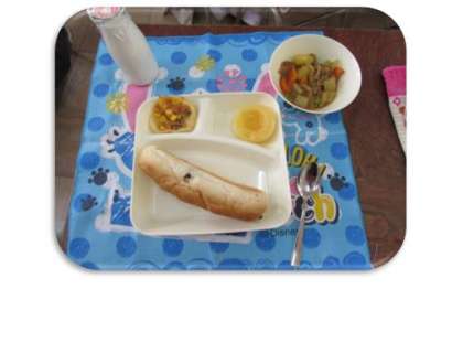 本日の給食の献立をご紹介します。本日の献立は、レーズンパン、豚肉と大根のカレー煮、かわりピザ、白桃の缶詰、牛乳でした。