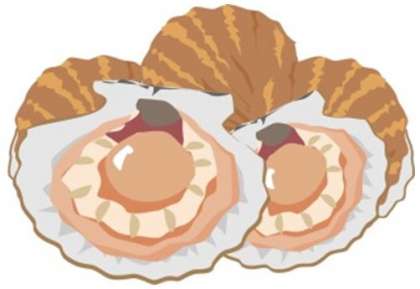ほたて貝は、寒い地方の海底にすんでいます。殻を勢いよく閉じて、海水を吹き出しながら、動きます。大きな貝柱があり、給食ではこの貝柱を使っています。