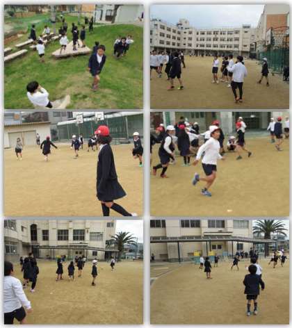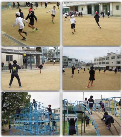 清掃が終わって、お昼休みです。運動場で、おにごっこをしたり、ボール遊びをしたり、遊具や双子山でも子どもたちが元気に遊んでいます。